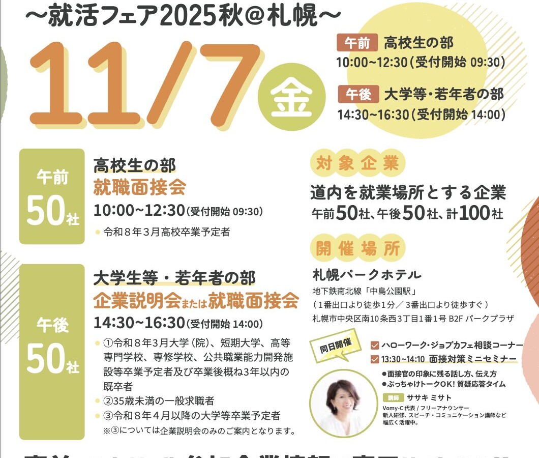 こんにちは。ササキミサトです。 昨年に続き、北海道労働局主催の「就活フェア」にて ミニセミナーに登壇しました。 昨年のレポはこちらから↓ 面接はコミュニケーション!面接で伝わりやすいワンポイント 今年も話し方・伝え方についてのワンポイントをご紹介。 「どんな話を伝えるか?」ではな...